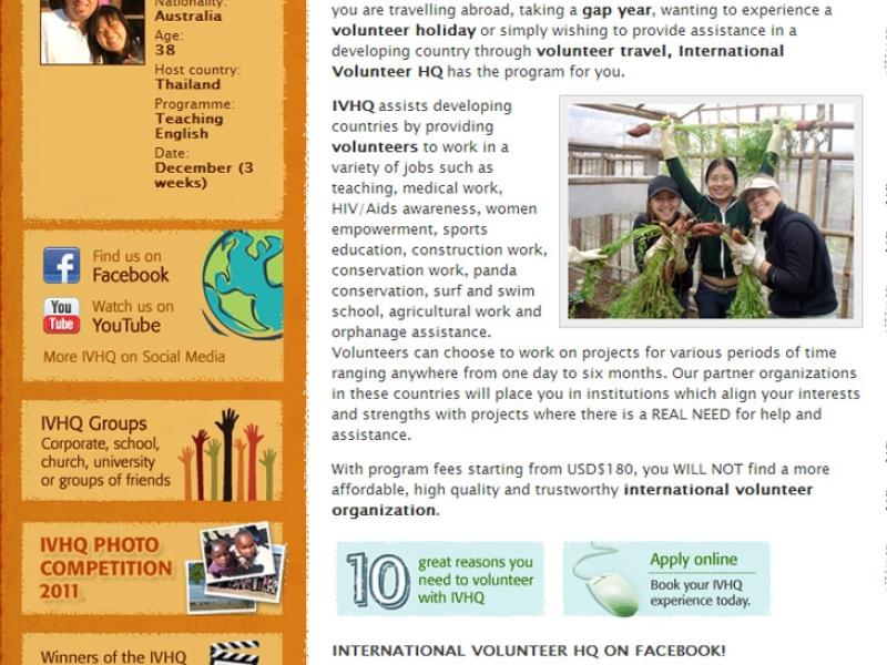 International Volunteer HQ provides quality, affordable volunteering placements in 16 developing countries all over the world, with plans for new countries to be added in 2011. IVHQ was a start-up company with the website officially launched July 2007 as a simple brochure website with a registration form.